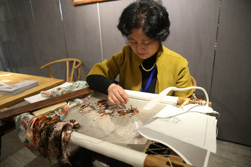 手艺人在上海大世界内的非遗展厅展示精微绣?!吧虾7俏镏饰幕挪故局行摹倍ㄎ挥诜且诺幕钐校谏璺且耪估?、非遗表演、非遗传习、数字非遗、非遗美食五个功能业态。丁汀 摄