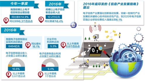 今年一季度,我国规模以上电子信息制造业增加值同比增长14.9%,同比加快6.3个百分点。2016年,规模以上电子信息制造业收入达12.2万亿元,同比增速为8.4%。“电子信息业发展要以突破核心技术瓶颈为中心,坚持两条主线,即积极推进供给侧结构性改革,加快产业转型升级;加强融合创新发展,全面支撑制造强国网络强国建设,保障国家信息安全”。工信部电子信息司副司长吴胜武说。