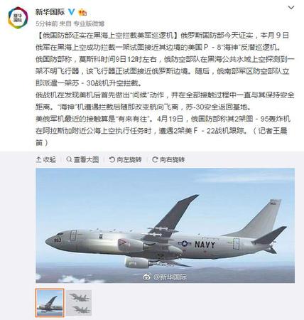 【俄国防部证实在黑海上空拦截美军巡逻机】俄罗斯国防部今天证实,本月9日俄军在黑海上空成功拦截一架试图接近其边境的美国P-8“海神”反潜巡逻机。