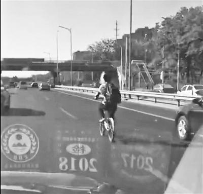 目击者向北青报记者提供的视频显示,一名身背黑色双肩包的年轻男子骑着ofo小黄车出现在高速路上,穿梭在多辆汽车之间。该男子踏脚蹬的频率很快很用力,还不时回头看一眼过往的车辆。