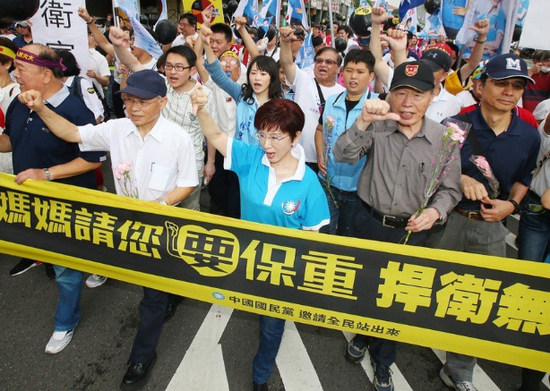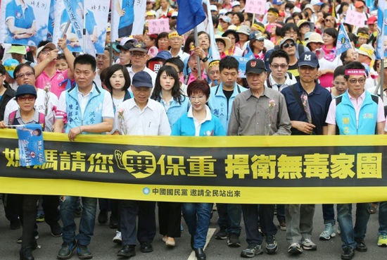 国民党下午举行“妈妈请您要保重。捍卫无毒家园”游行,由党主席洪秀柱领军,到民进党中央抗议蔡当局执政无能,要蔡英文下台。(图片来源:台湾《联合报》)