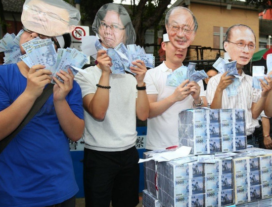 国民党下午举行“妈妈请您要保重。捍卫无毒家园”游行,参与群众带着民进党官员面具讽刺前瞻计划是洒钱计划。(图片来源:台湾《联合报》)