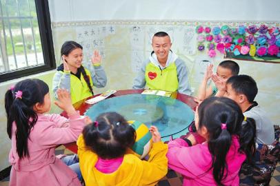 4月17日,贾剑波(右)和宋欣承作为当地开展公益项目的负责人,正在给当地的小朋友上课外活动课。 本报记者 郝飞 摄