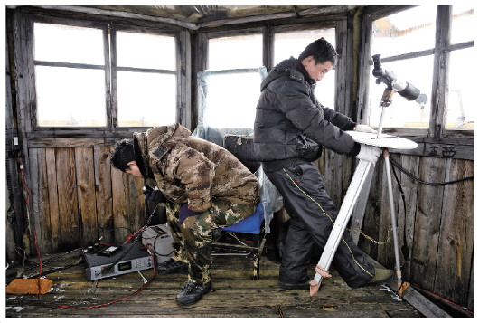 △塔楼里,许俊国(左)正通过电台向县防火指挥部报告情况,鞠建国(右)在忙着调整定向定位仪。