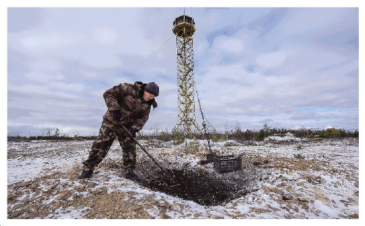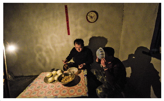 △瞭望员在节能灯微弱的光线下默默地吃着晚饭。炒土豆片和馒头是他们最常吃的,为省柴火,一次要做出不少菜。