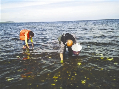 边苗苗(左)和家人在丹麦海边挖生蚝