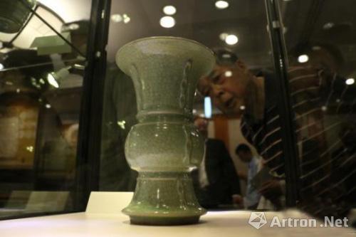 古陶瓷爱好者在参观展出的南宋龙泉冰裂纹出戟尊