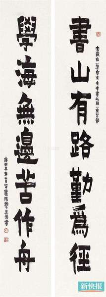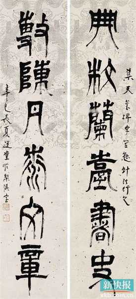 ■饶宗颐 2001年作 篆书六言联 释文:典枚兰台书史,敷陈丹赤文章。钤印:饶宗颐印、梨俱室??钍?集天玺碑字,以悬针法行之。辛巳长夏,选堂于梨俱室。