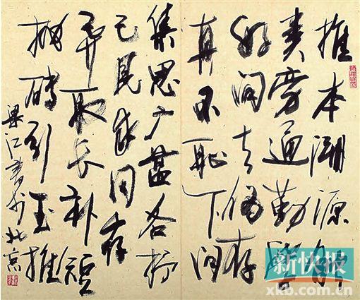 陈树人画风清新恬淡,作书以中锋为主,笔划多不连属,字体略见隶意,朴拙凝炼的特色与画风很协调。赖少其的书法与其木刻家身份有关。他追求金石韵味,可看出其中与碑帖的内在关联,但更重要的还在于他的个性与追求。