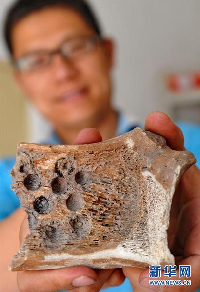 5月14日,考古人员展示在河北省肃宁县北白寺村西的商周遗址抢救性发掘现场出土的卜骨。近日,河北省文物部门在引黄入冀补淀(白洋淀)工程文物调查勘探中,在河北省肃宁县北白寺村西发现一处商周时期遗址。经过初步发掘,目前已出土有商末周初时期的陶器、石器、骨器等遗物。据现场考古人员介绍,随着抢救性发掘工作的推进,可能会发现更早期的文物,对研究当地的文化具有重要意义。