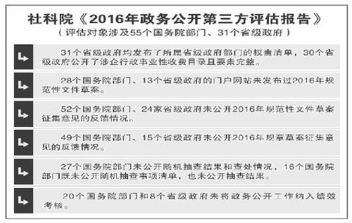 受国务院办公厅政府信息与政务公开办公室委托,中国社会科学院法学研究所对55个国务院部门、31个省级政府的2016年政务公开工作开展了第三方评估,并在今天对外发布《2016年政务公开第三方评估报告》。