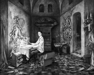 巴罗相信,在人们看不见的另一个时空存在着千奇百怪的生物。因此她的绘画充满飘忽不定的精灵。有的从抽屉钻出来,有的从地面探出脑袋,有的依附于人的身体,有的隐匿于夜空、古堡、墙壁、树林之中,它们在巴罗的画中似不经意地闪现,却向人们透露着另一个维度世界的存在。巴罗认为这个世界或许与人类世界平行,或许秘密地窥探着人类的活动,生活其中的生物在现实的时空默不作声,却悄然与人类进行着游戏。如画作《决裂》中隐藏在塔楼上窥伺头戴风帽女人远行的精灵们,《令人不安的存在》中从椅背探出脑门舔舐女主人脖颈的神秘精灵,《相会》中坐在桌边与半隐箱内的精灵互相对视的女主角,《和谐》中隐藏在墙壁、抽屉、椅背里陪伴主人公谱曲的活跃精灵,以及《意外到访》中从橱柜探出半个头,与被另一个精灵抓住手腕的女主人共进晚餐的精灵,等等。这些精灵有被塑造得淘气调皮、古灵精怪,也有被塑造得阴森恐怖、令人生畏,它们在巴罗的画作中灵动跳跃,忽闪忽现,暗示着人类看不见也摸不着的另一个维度的空间。墨西哥著名文学家奥克塔维奥·帕斯这般评述巴罗的创作:“这个女人缓慢地画出快速闪现的幽灵?!?/p>