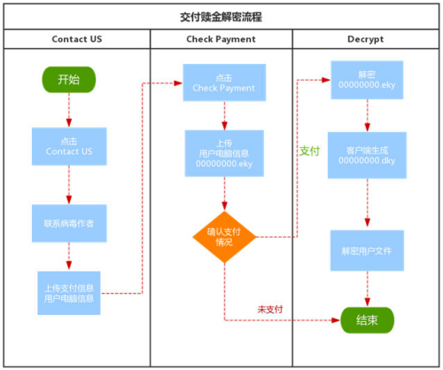 受害者等待一段时间后点击Check Payment,这时病毒会上传受害者的tor key、电脑名、电脑账户名、比特币转账地址等询问服务器该受害者是否被确认已经付款,然后病毒会上传受害者的一个带有被加密过的解密key文件(00000000.eky)到服务端,服务端如果确认受害者已经付款会把上传上来的key文件解密,并返还给受害者(00000000.dky),然后提示可以解密。