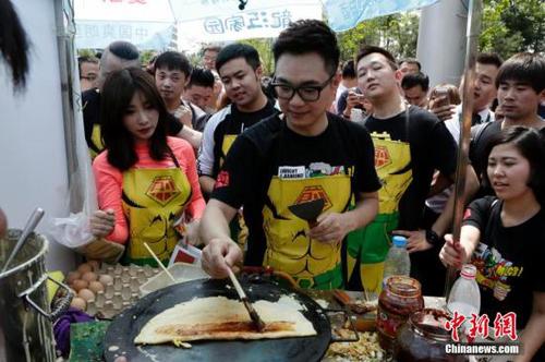 资料图:明星街边摊煎饼送影迷。 中新社发 李慧思 摄