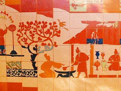 《盘龙通衢》用七个单元表现地铁站点附近盘龙城遗址3500年前的人文历史风貌。壁画色彩取自遗址现场的天然土色和博物馆中出土的典型器物。材料主要由天然岩彩绘制而成,并将岩彩绘画层面叠加的表现方式转译为标准化的工艺制作流程。