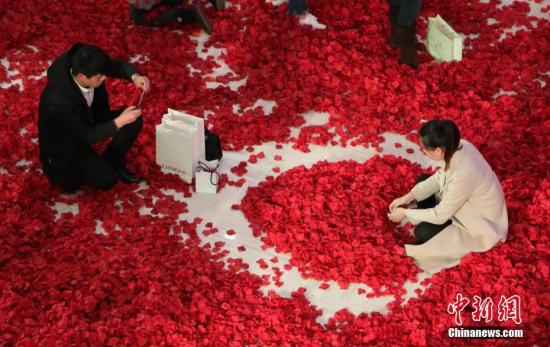 资料图:一对情侣用仿真玫瑰花瓣摆出爱心造型。 王刚 摄