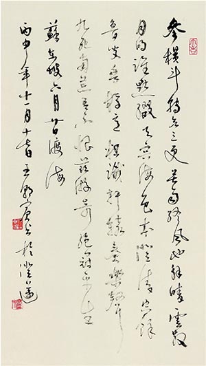 “1999年我担任《汉碑全集》的项目负责人。在编辑《汉碑全集》的过程中,我东奔西走。足迹遍及十数省,对国内各地汉碑及旧藏拓本,新出工的汉代碑刻进行了全面的实物考察。通过这几年的研究,我不仅收集了详实的资料,还弄清了前人对碑拓的误读,由此窥得汉碑书法的真谛。我在青年时期曾决心‘下笔便到汉人处’,但早年写的隶书与汉人还是相距甚远。自从编辑《汉碑全集》,遍阅汉碑拓本和汉刻原石后,对汉代书法风采的认识深入了许多,笔下的汉人气息也增加了许多。自此以后,我将隶书和行草结合起来,写隶如写草,落笔使墨,准狠疾速;写草若写隶,浑厚结实,融汉铸晋,我的书法境界从早期的‘达’转向了‘雅’,前期作品中险绝有余而内涵不足得到了充实”。王朝宾的夫子自道传递的信息胜过许多旁人的赞词,“魂系汉唐”的他对魏晋风流也是充满敬意,他的古质天真的行草书一片魏晋书家的风度,比之今天江南书家临仿魏晋的作品多了几许朴茂健朗,即便在河南,能够像王朝宾那样深入骨髓、多种气韵风格把握的书法家也是极其少见的,更难能可贵的是在商品经济的社会大环境里,他仍然保留文人的清远儒气与性情,笑对书坛枯荣,笑对人生百态。