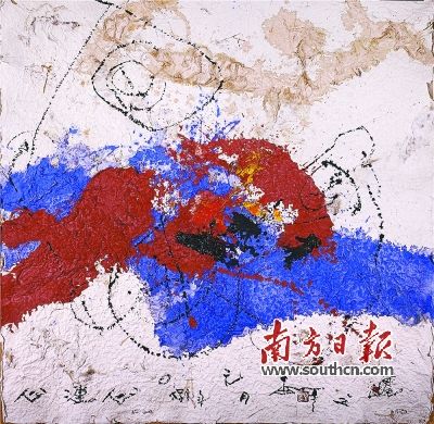 1996年,古干为罗斯柴尔德家族木桶葡萄酒设计了酒签,此为同系列的汉字水墨作品《心连心》,作品柔性的水墨线性语言和明亮而温暖的色彩相融合,表现出人与人之间心心相印的欢愉情绪。