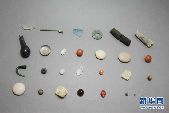 这是邺城遗址舍利函中的部分器物(资料照片)。邺城考古专家近日公开披露,之前在位于河北的邺城遗址挖掘出的舍利函保存完整,发现可能用于盛放舍利的长颈玻璃小瓶以及玛瑙珠、白玉髓环、玉髓珠等。据介绍,舍利函发现于邺城遗址核桃园1号基址,这里是北齐皇家佛寺大庄严寺佛塔的遗存。