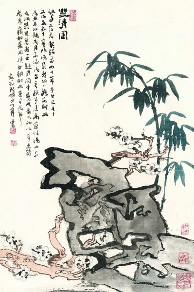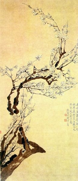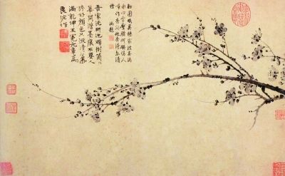 通过这一道取舍剪裁,梅画在美术史上便有了“疏朗”与“繁密”之分,汪士慎的墨梅大多是疏枝浅蕊、简淡冲雅,王冕的墨梅则是千丛万簇、万玉争辉。而更多的画梅名家则是能简能繁、能疏能密。由此可见,对“赏心只有两三枝”的创作原则不能作死板的理解,“疏朗”与“繁密”是相对的,要从画作的立意和整体布局中评判其中的疏密是否合乎取舍之道。