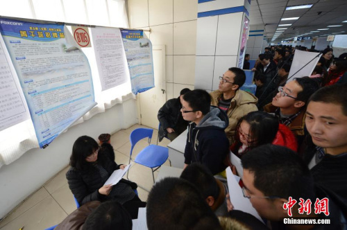 资料图:2014年2月7日,山西太原人才市场富士康太原工业园区招聘处,聚集了大批应届大学毕业生前来应聘。中新社发 韦亮 摄