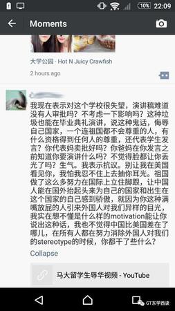 【留美学生演讲辱华本人回应并致歉:没贬低国家】在朋友圈中,也有同学也表示了对于校方这样安排的不满: