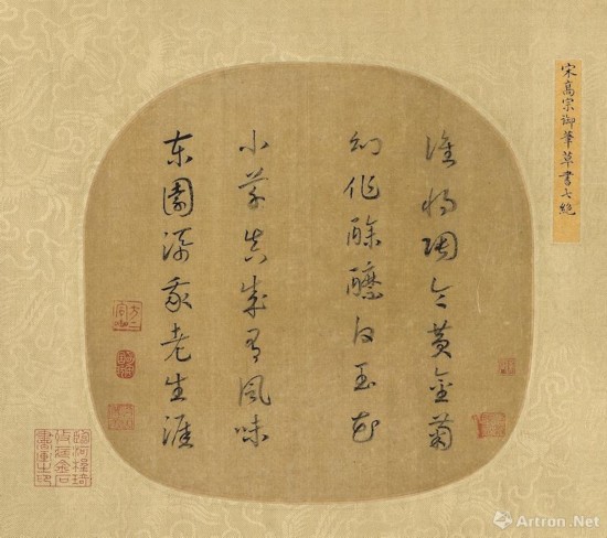 传世宋高宗的存世作品只有数十件,这件手卷中的《御笔草书七绝》是出自于黄庭坚的《戏答王观复酴醾菊》二首中之一:谁将陶令黄金菊,幻作酴醾白玉花。小草真成有风味,东园添我老生涯。