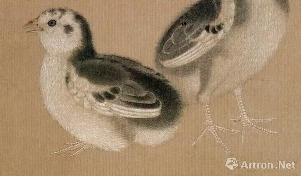 《鸡雏待饲图》被项元汴评其为“神品”,画面不作背景,只以黑白黄三色细笔勾描鸡雏细润丰满的毛羽,两鸡雏或立或卧,张口而鸣,神态生动,十分可人。