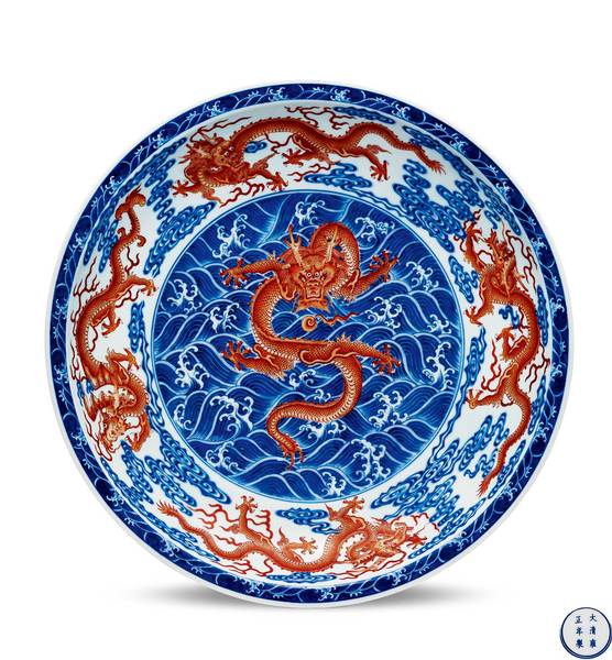LOT 3928 清雍正 青花矾红“水波云龙”纹折沿大盘