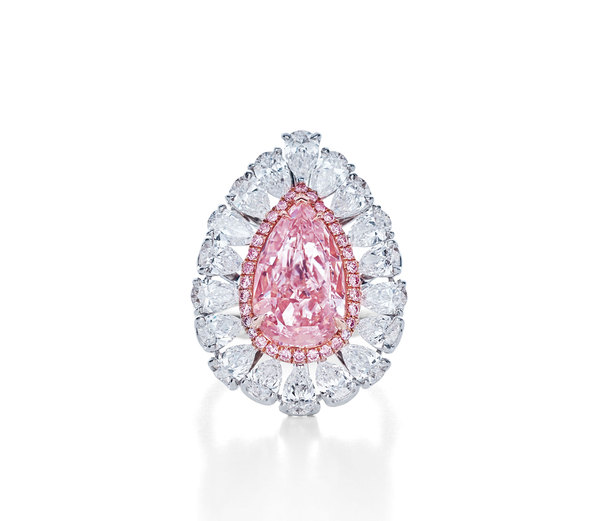 18K白金镶嵌5.54克拉梨形切割的纯彩粉红色钻石,净度为VS1级别,极好切割与打磨,无荧光反应,周边镶嵌共4.63克拉无色钻石,指环尺寸13,附GIA证书