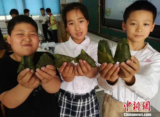 资料图:学生们展示他们包的粽子?!√凭?摄