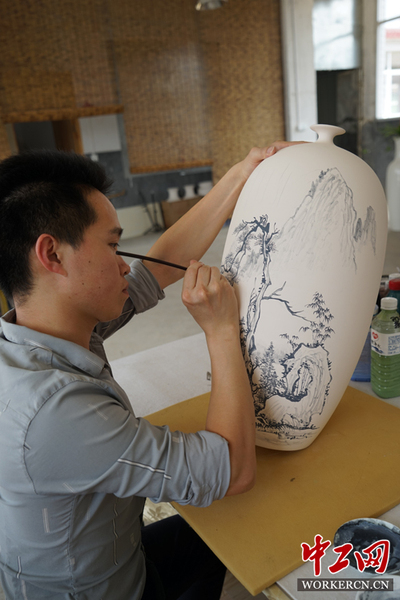 日前,当笔者见到童英杰时,他正和妻子、工人们聚精会神地创作,他们手里原本一片空白的白瓷瓷器,在七彩画笔下被赋予了新的生命,让人无法置信这一件件精心制作的艺术品,是这家小型陶瓷工厂的产品。童英杰向我们讲述了他的创业创新故事。