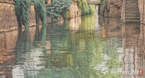 上世纪九十年代,吕吉人第一次回国陪父亲探亲,从苏州开始,一路走访周庄、同里、绍兴、西塘、朱家角等地,点燃了其内心的水乡情怀和思想之切,故此,艺术家笔下的水,自纽约中央公园的《秋艳》和威尼斯的海水转向国内古镇。有趣的是,不同作品中的水面倒影都别具一格,这其中有三个诀窍——表现水面的平度、注意倒影的深度、把握水的动感。吕吉人进一步解释:“水影与风很有关系,无风、微风、小风、大风中的波纹都是不一样的;青蛙入水、鱼儿戏水、小船划水、浣纱拨水的涟漪也是不一样的;大雨、中雨、小雨的水纹也各有不同?!?/p>