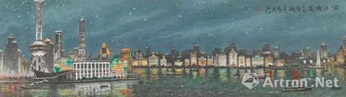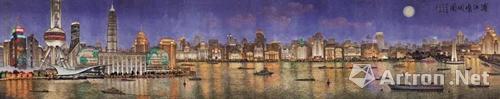 有别于描绘古镇江水,创作于2000年的《浦江灿烂图》将水光潋滟融入都市图景。对于这幅全景式构图的作品,吕吉人曾撰文表示:“去美国前,浦江两岸一边是殖民时期的洋楼和人潮涌动的街巷,一边则是成片的工厂、低矮的农舍和宽阔的农田。我没有想到,在我离开的那些日子里,这里的变化巨大而令人震慑?!逼纸谋浠盟拇醋魇咏恰氨涞昧槎薄笆降厣笫幼耪馄煜ざ吧募以?。