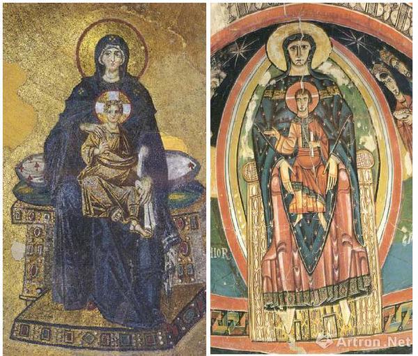 左边:圣母子像局部 867年 右边:庄严的圣母局部图 11 世纪