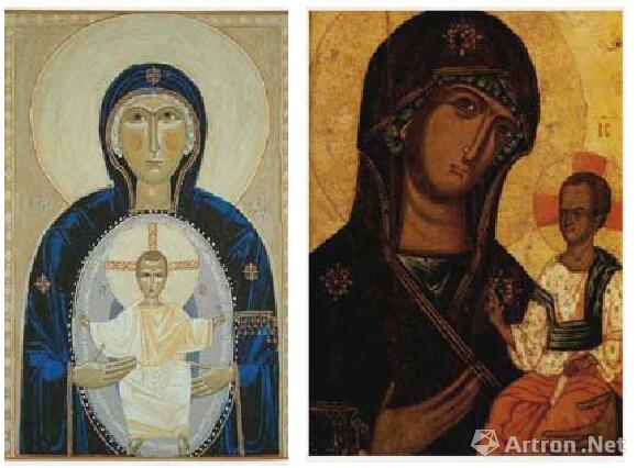 其实是仿照国立特列季亚科夫画廊藏的《弗拉基米尔圣母像》绘制的,也是一幅具有代表性的作品,与传统的拜占庭风格圣像有明显的不同,玛利亚的表情是哀伤的,这是拜占庭风格没有的。另外,圣母的脸右面大于左面,嘴也微向右偏,拜占庭的圣像都是严格的遵循圣像画的图像规则,不会允许如此自由的创作。