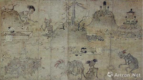 《骷髅幻戏图》不同于一般的画作,它以一具操纵傀儡的骷髅为中心,所操纵的傀儡也是骷髅的形象。这具大骷髅的两旁都有母亲与婴儿的形象,整幅画在思想表达上贯穿生死。日本虽然深受我国文化的影响,但日本人对于人死后的看法略有不同,日本国宝《饿鬼草纸》展示了日本平安时代末期日本盛行六道轮回思想,生前犯下罪业的人死后会在地狱道、饿鬼道等六道徘徊。而沦为饿鬼者会苦于饥饿口渴,形骸消瘦而却腹部鼓起,取食尸体或粪尿,受到非常痛苦的折磨。画卷中以明快的线条赤裸裸地描绘出、堕入饿鬼道的饿鬼令人厌恶的容貌及姿态,以及佛菩萨如何救济饿鬼的场景。