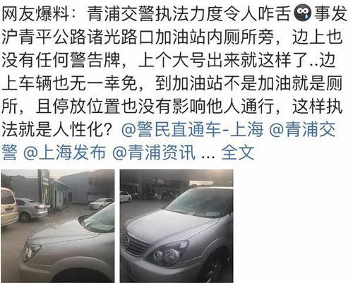 5月24日,一名网友发微博称,当日下午一名驾驶员到上海青浦区一个加油站上厕所,出来后就发现被交警贴违停单,“停放位置也没有影响他人通行,这样执法就是人性化?”