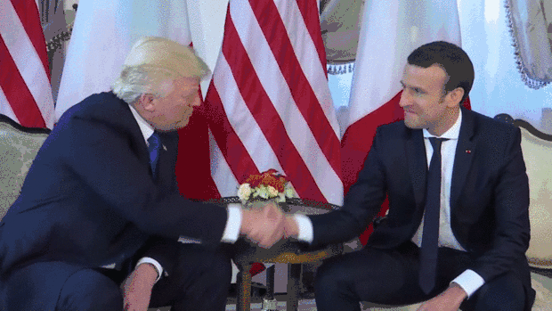 71岁的特朗普恐怕未曾料到39岁的马克龙如此“给力”,连手都被人家握白了,自己最后不得不先松开。