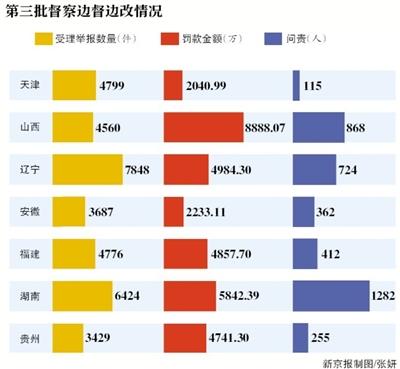 据统计,7省市中,督察组受理的群众举报最多的省市是辽宁省,为7848件;其次是湖南省,为6424件,群众举报案件最少的是贵州省,数量不及辽宁省一半,为3429件。