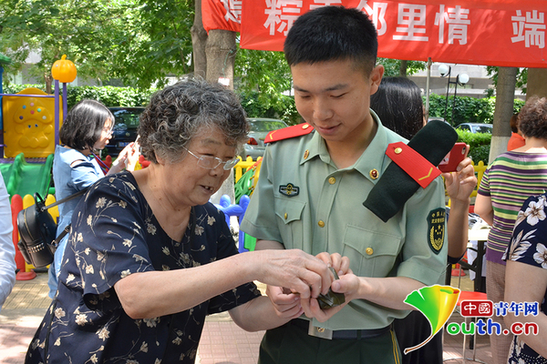 5月27日,武警北京总队七支队的官兵走进多个街道社区,参加端午节慰问活动,与居民一起包粽子、话家常、过端午。