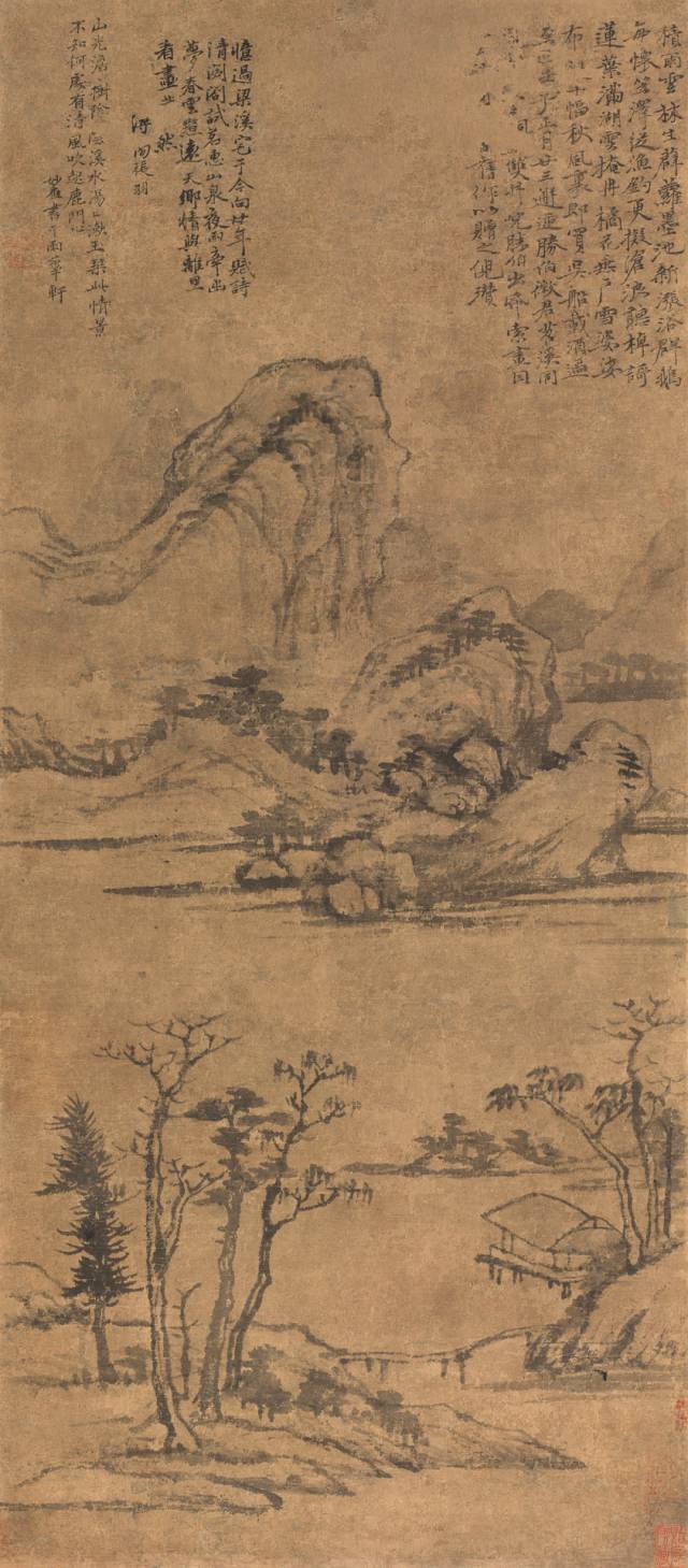 此外,两件《溪山亭子图》颇为有趣。其一为虞堪上款、张羽、妙应题跋、吴宽旧藏的倪瓒《溪山亭子图》,其二则为伍元蕙、区汉波旧藏、苏庚春题签并题裱边的董其昌仿倪瓒《溪山亭子图》。