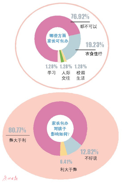 日前,本报在网上对“家长包办”这一话题进行了调查,发现在以家长为主的受访者中,有超过八成的人认为家长包办“弊大于利”,然而在现实中,许多家长却意识不到自己的行为是“包办”。不仅孩子们不喜欢,也有不少因为家长爱“包办”而感到郁闷的老师。教育专家表示,家长包办、干预、照顾得太多,对孩子的成长会造成较大的负面影响,容易高分低能。因此,在孩子成长的每一个阶段,家长都应该适时放手。