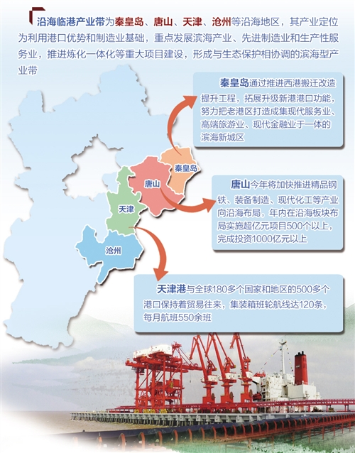 借助京津冀港口群优势和制造业基础,天津和河北秦皇岛、唐山、沧州等地重点发展滨海产业、先进制造业和生产性服务业,形成与生态保护相协调的滨海型产业带——