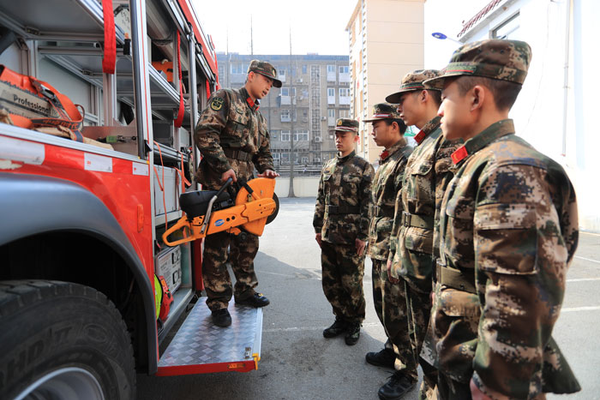 万文韬(左一)为战友讲解示范装备器材。图片来源:襄阳文明网