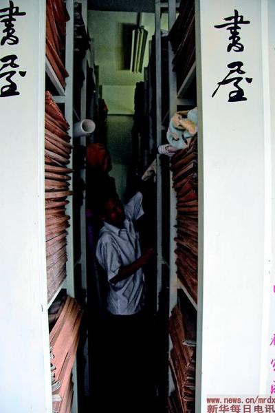 ▲知海书屋二楼,用来收藏报纸的书架“顶天立地”,架上装订好的旧报纸整整齐齐。(4月29日摄)
