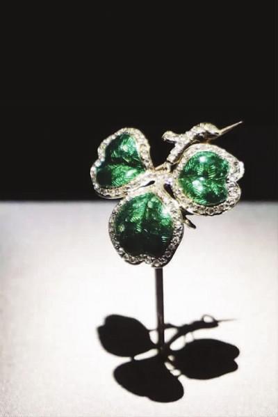 一枚制作于1852年的“三叶草”胸针,主人是拿破仑三世的皇后欧仁妮·德·蒙蒂若。这位皇后以时髦著称,她的穿着打扮在当时是上流社会的标志,甚至成就了后世的许多奢侈品牌,如路易·威登、卡地亚、古龙香水。由绿色半透明珐琅与钻石、金、银共同打造的这枚胸针,高3.7厘米,宽3.4厘米,是拿破仑三世与欧仁妮的订婚信物,代表着瞬间的感动和爱意初萌的美妙。婚前的一天,欧仁妮皇后漫步在贡比涅宫花园,突然被沾满露水的三叶草所吸引,而这一幕正好被未来的皇帝、拿破仑三世看在眼中。拿破仑三世急忙传召珠宝工匠儒勒·弗森设计了一枚小三叶草胸针作为订婚礼物。这枚胸针日后欧仁妮皇后珍视了一生。