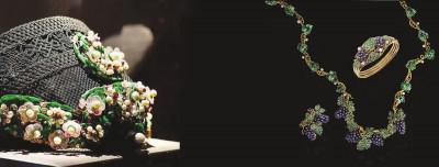 依照法国皇室的礼仪,一天之中皇后需要更换三至四次衣服,并且都有配套的首饰。当年的皇后在夜间出席正式场合时必须佩戴全套,而全套首饰重达约四公斤。在此次展览中,人们看到了不少成套的首饰,它们有着不同的用途,分别被佩戴在头、耳、项、手腕、腰等不同部位,设计师却提炼出相同的设计元素,使它们看上去浑然一体、相互映照。露易丝皇后的一套日间首饰,是用微砌马赛克制成的,描绘希腊、罗马神庙与废墟的微砌马赛克通过精雕细琢的黄金葡萄藤枝叶与藤蔓连结在一起,引领了新古典主义珠宝黄金时代的到来。一套制作于约1850年的葡萄串全套首饰,则为弗森赢得了国际声誉,只见金、翡翠、紫珍珠与珐琅等材质将葡萄串和葡萄藤枝叶的动作与色调拿捏得栩栩如生,令人惊奇万分,成就浪漫主义审美的典型之作。