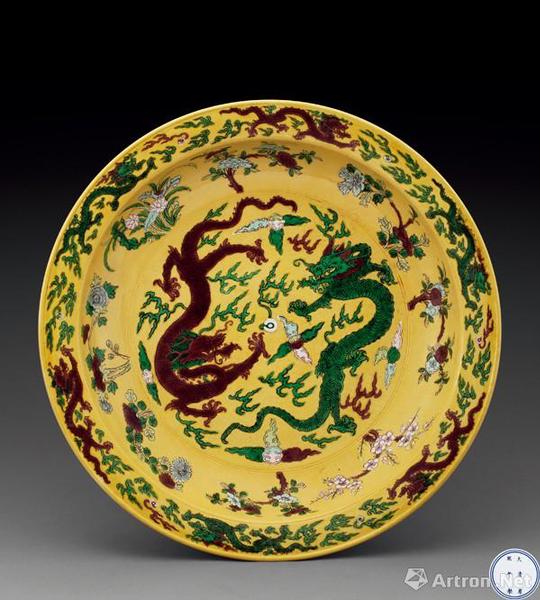 清康熙 黄釉赭绿龙四季花卉折沿大盘