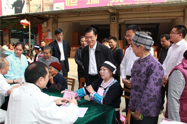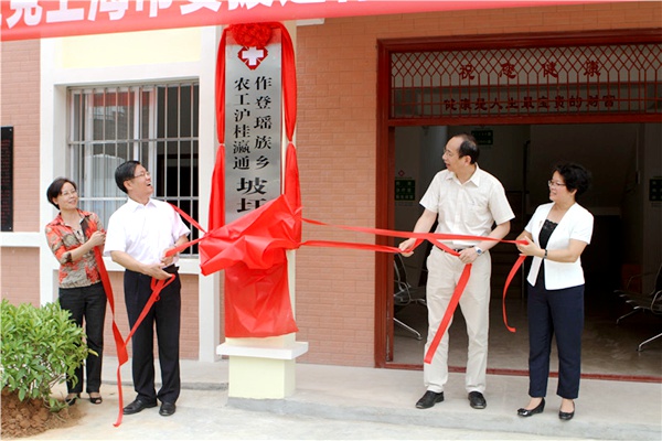 农工党上海市委会出资20万资金帮扶田东县作等瑶族乡坡圩村建设乡村卫生分院。图为农工党中央副主席、上海市委会主委蔡威(右二)与农工党广西区委会主委彭钊(左二)为坡圩卫生分院落成揭牌。